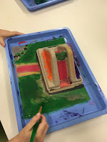 We painted using tempera paint. We glued using white liquid glue-sometimes way too much! And we decorated with wooden sticks, paper scrapes, leather scrapes, foam pieces, puzzle pieces, leftover die cut leaves (I don't think I'll EVER use them ALL up!). Buttons, bottle caps and anything else I thought would work. I did this with grades first to third and happily have enough to do with my fourth grade starting next week. Some of the larger classes took 2 class sessions to paint. But some of that was because of logistics. Handing out stuff, clean up and so on.....